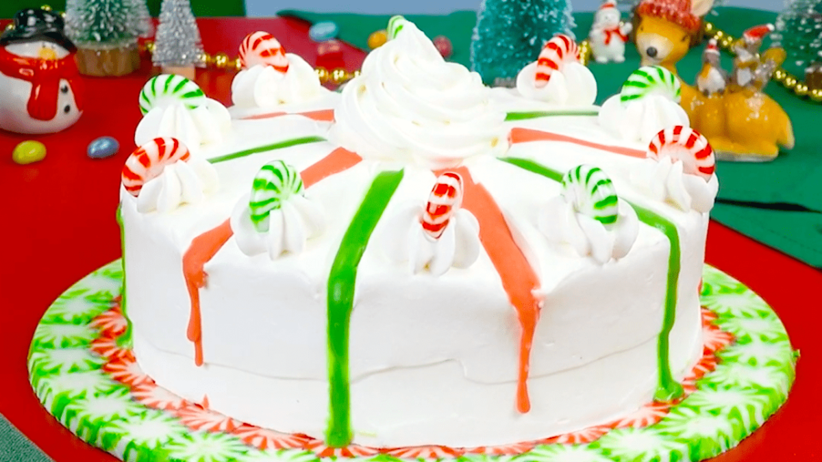 Auf einer bunten Platte aus Pfefferminzbonbons serviert, mit saftigen Brownie-Kuchen gefüllt und von sanfter Frischkäsecreme ummantelt, ist diese wunderschöne Weihnachtstorte ein wahres Fest für die Sinne!