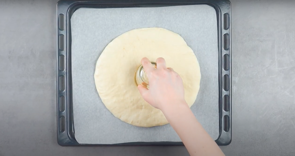 2.1 Lege ein Backblech erneut mit Backpapier aus. Gib einen hellen Hefeteig mittig auf das Backpapier und bringe den Focaccia-Brotteig mit der Kuchenform entsprechend in Form. Stich dieses Mal anschließend zudem mit einem Glas mittig ein Loch aus dem ausgebreiteten Focaccia-Teig aus.