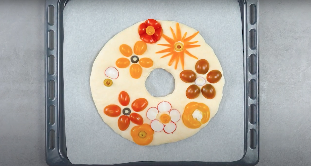 2.2 Schneide zuerst das oben aufgelistete Gemüse zurecht und dekoriere mit den Oliven, Kirschtomaten, bunten Paprikas, Radieschen, der roten Zwiebel und dem Blumenkohl den Brotteig so, dass ein schönes Blumenkranz-Muster entsteht. Garniere abschließend mit Salbei und Blattpetersilie.