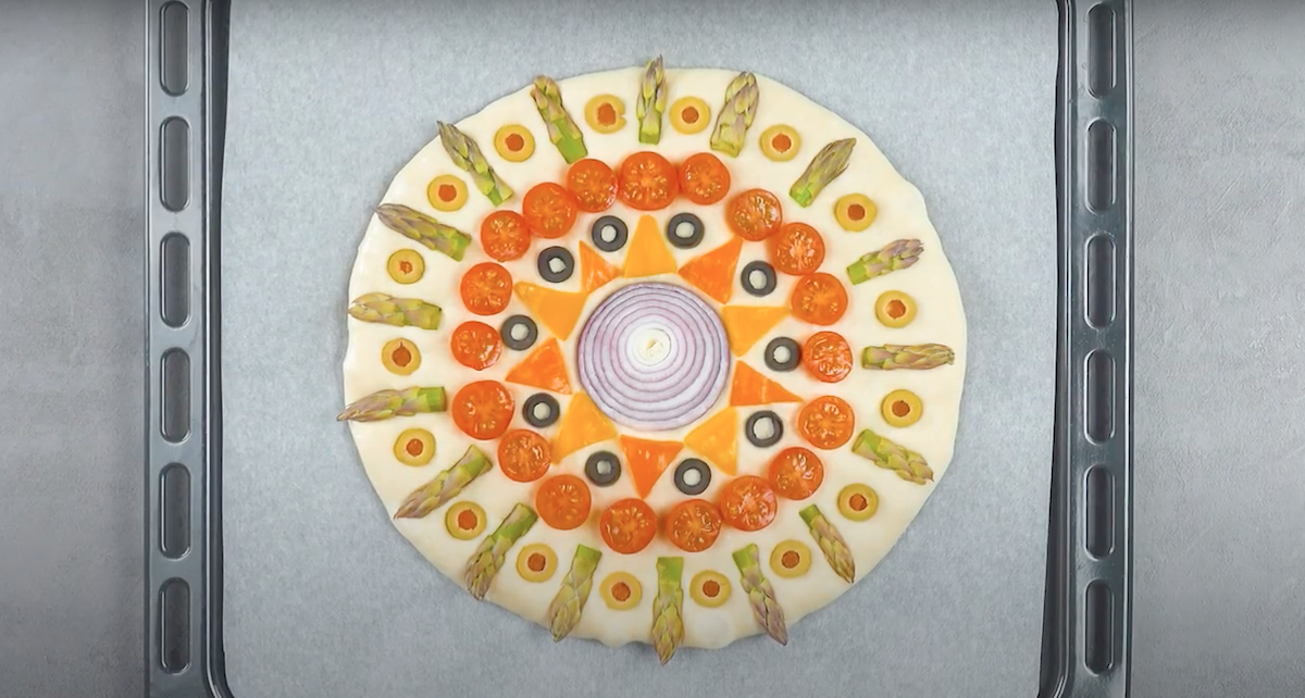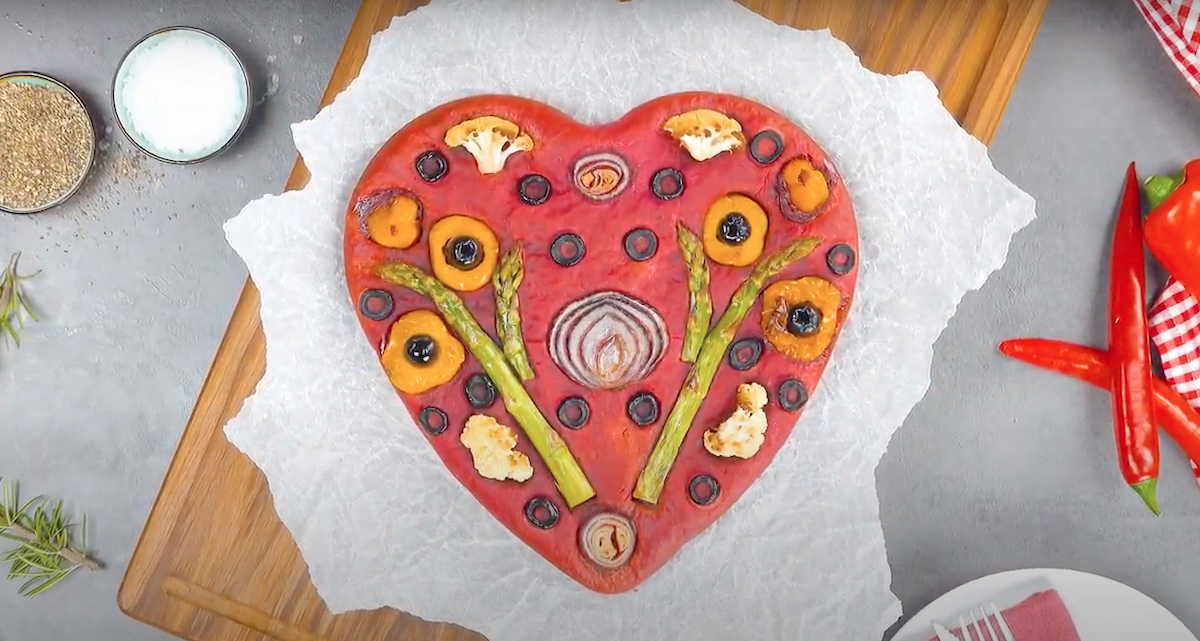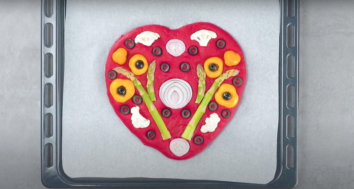 4.2 Lege, wie auf dem Bild zu sehen, grünen Spargel, rote Zwiebel, schwarze Oliven, gelbe Paprika und Blumenkohl auf den Rote-Bete-Herz-Teig und forme dabei ein schönes Muster. Auch hier gilt: Sei kreativ und hab Spaß daran!