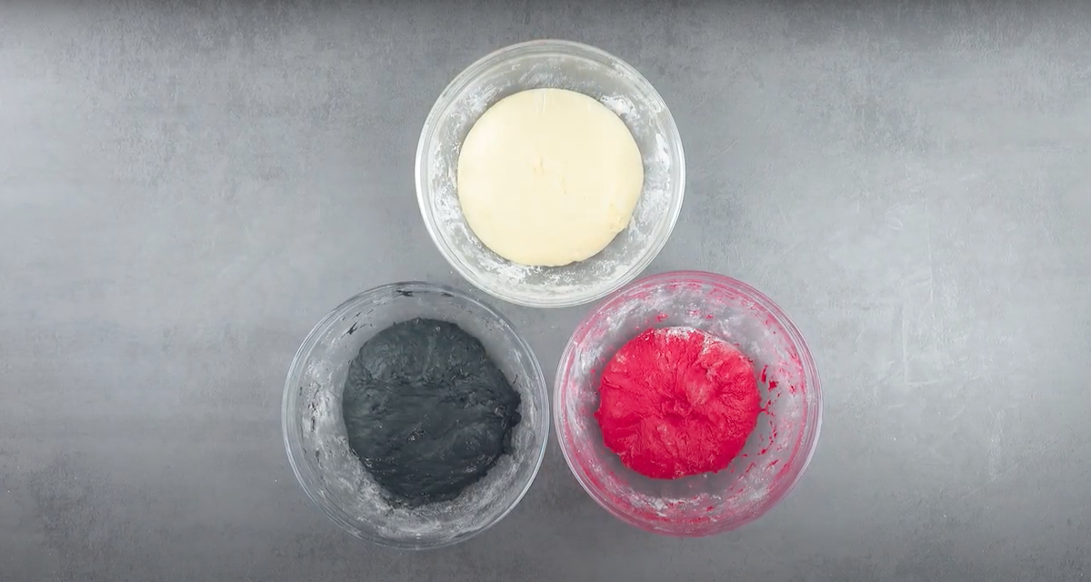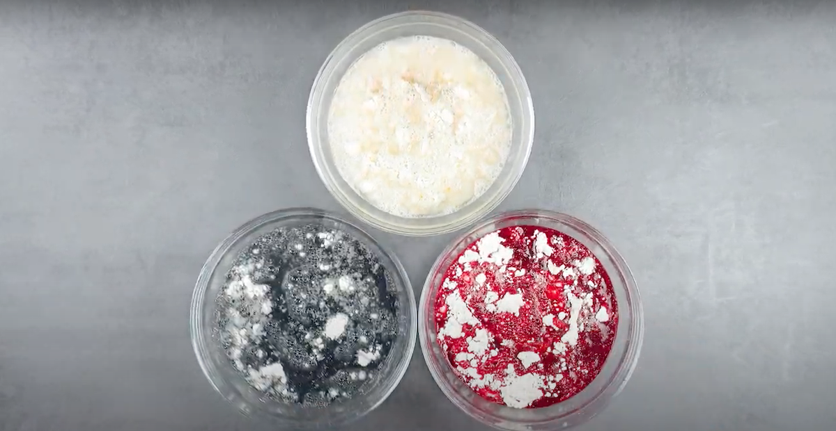 b) Füge den Schüsseln, in denen du einen hellen Hefeteig herstellen möchtest, jeweils 350 ml lauwarmes Wasser hinzu. Löse für den dunklen Teig 4 Kohletabletten in 350 ml Wasser auf und gib diese Flüssigkeit in einer weiteren Schüssel zum Hefeteig hinzu. Gib den Rote-Bete-Saft in die fünfte Schüssel zum Hefeteig hinzu, vermenge alle Hefeteige mit der Hand und knete diese, bis sie kaum noch an den Händen kleben. (Es bietet sich an, hierbei Handschuhe zu tragen.)