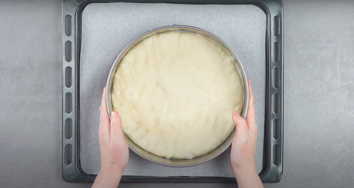 1.1 Lege ein Backblech mit Backpapier aus, gib die runde Springform mittig darauf und nimm die erste Schüssel mit dem klassischen (hellen) Hefeteig zu dir. Gib diesen in die Kuchenform und bringe den Brotteig in Form.