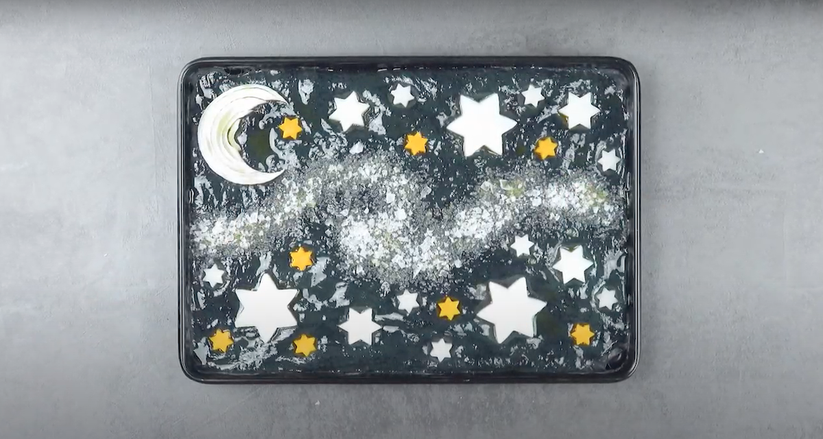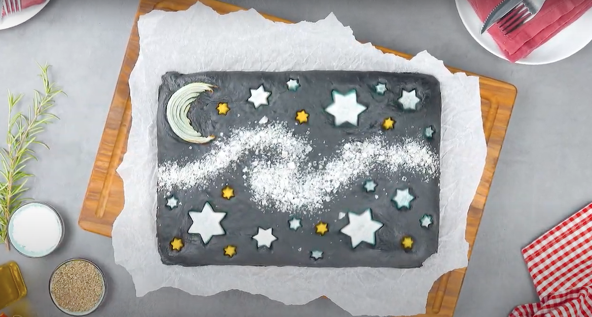 5.2 Streue die Salzflocken mittig auf den schwarz eingefärbten Hefeteig, wie unten zu sehen ist. Stich dann mit den großen Stern-Ausstechern den Rettich aus und platziere die ausgestochenen Sterne auf dem ausgebreiteten Hefeteig. Mach dasselbe mit einem kleinen Stern-Ausstecher bei der gelben Möhre und lege diese ebenfalls schön auf den Aktivkohle-Hefeteig. Bringe die Zwiebel in die Form eines Mondes und platziere diesen zuletzt auf der rabenschwarzen Nacht.