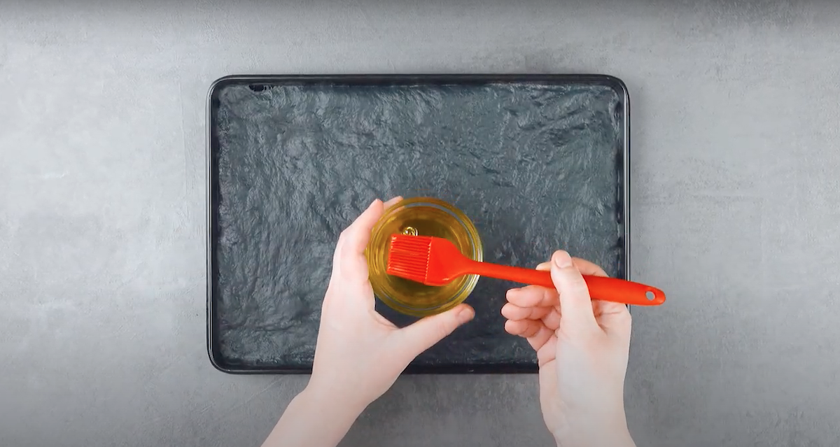 5.1 Breite den schwarz eingefärbten Focaccia-Brotteig auf einem Backblech aus und bestreiche ihn mit Olivenöl.