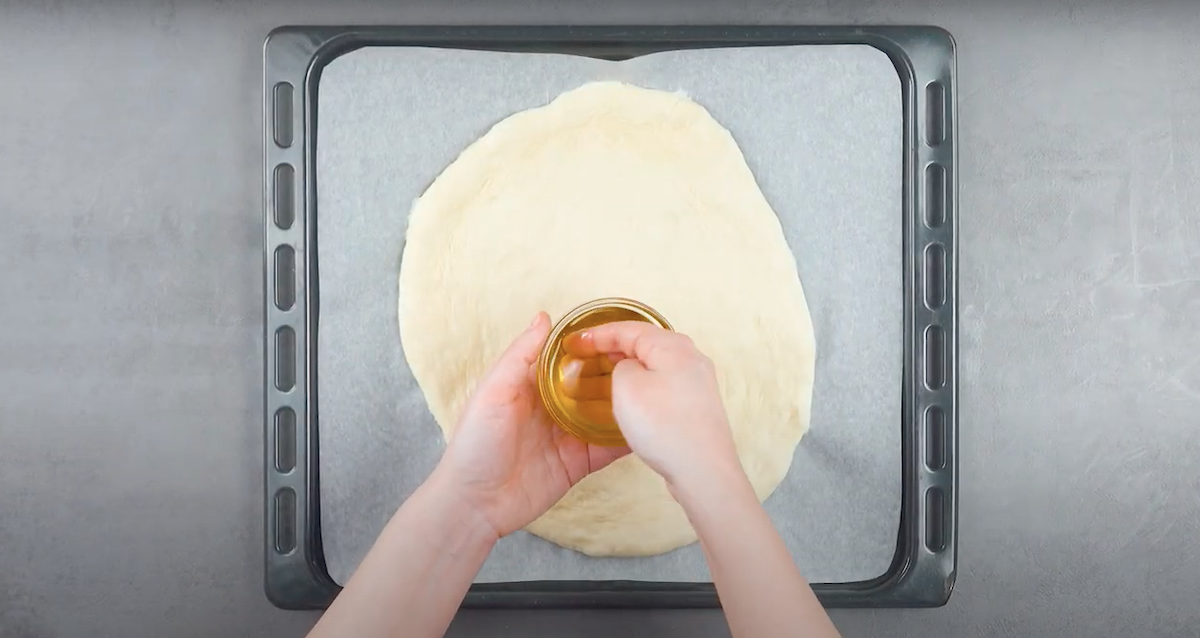 3.1 Breite einen der vorbereiteten hellen Brotteige auf einem mit Backpapier ausgelegten Backblech „freestylemäßig“ aus und bestreiche ihn mit Olivenöl.