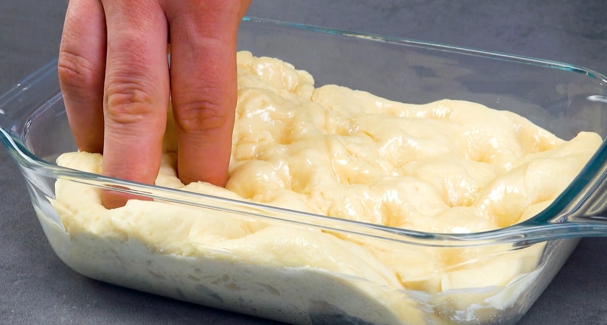 Fette anschließend ein paar deiner Finger in Öl ein und drücke mehrere Kuhlen in den Teig.