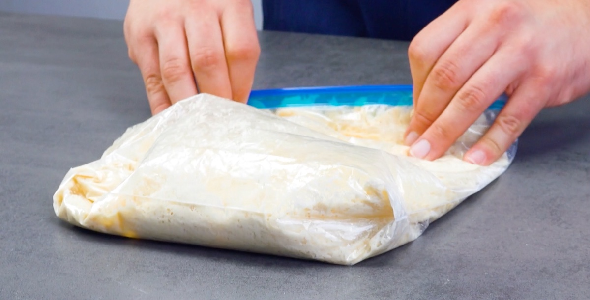 Gib alle Zutaten in den wiederverschließbaren Beutel. Drücke so viel Luft wie möglich aus dem Beutel heraus und verschließe ihn. Knete die Tüte dann 5 Minuten, bis sich alle Zutaten gut miteinander vermengt haben. Drücke den Teig in der Tüte dann etwas flach und lass ihn für 45 Minuten gehen.
