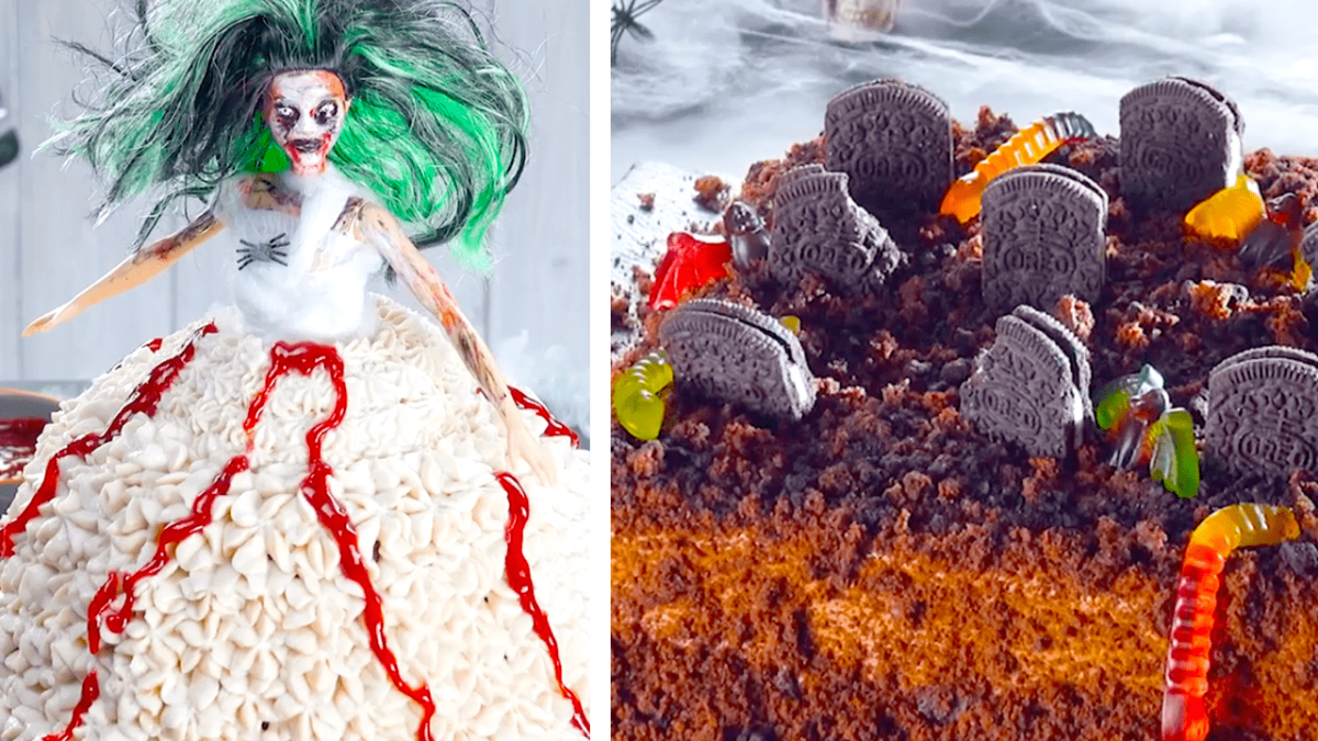 Wer es doch etwas schauriger mag, der kann sich von diesem furchterregenden Friedhofs-Kuchen mit Würmern oder einem Kuchen im Stil einer wirklich gruseligen Zombie-Braut inspirieren lassen.