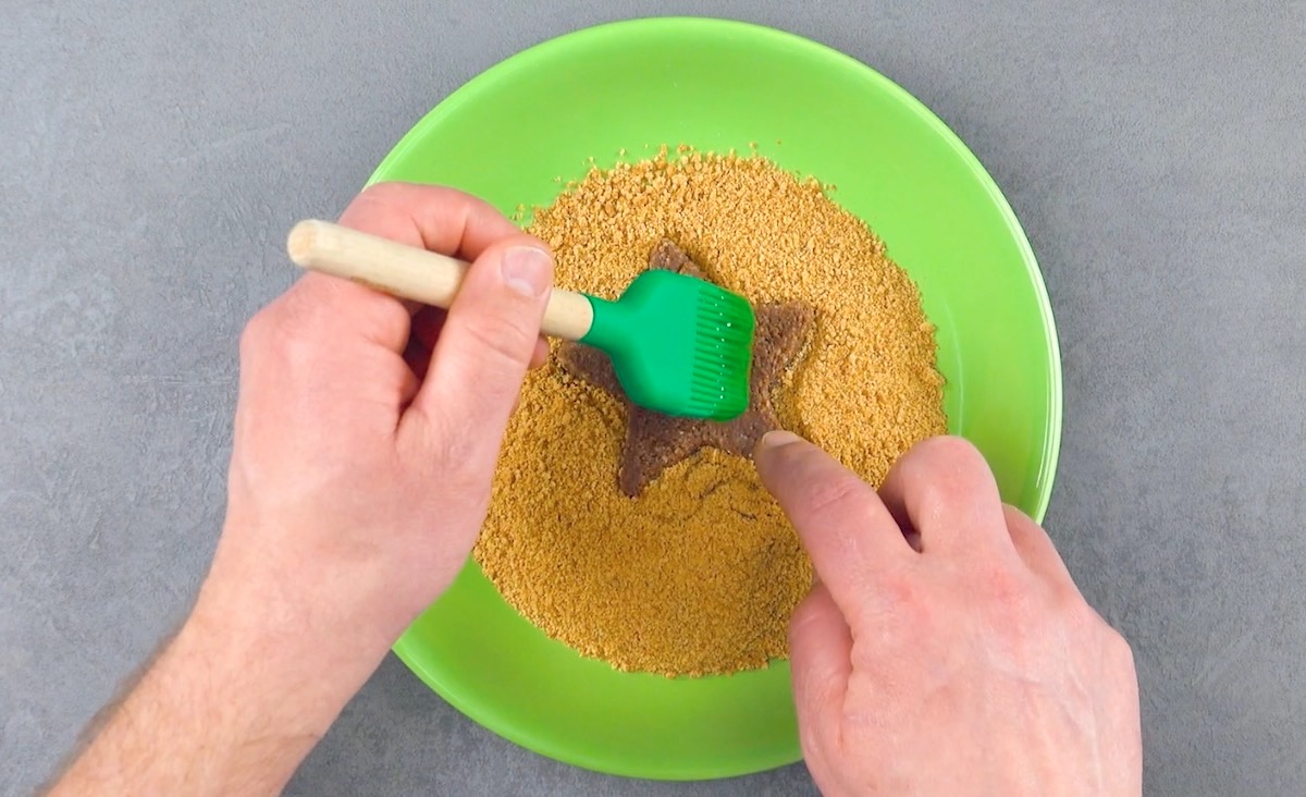 4.2 Zerkleinere Vollkornkekse. Streiche die Sterne von beiden Seiten mit Honig ein und bedecke sie dann mit den zerkleinerten Vollkornkeksen.