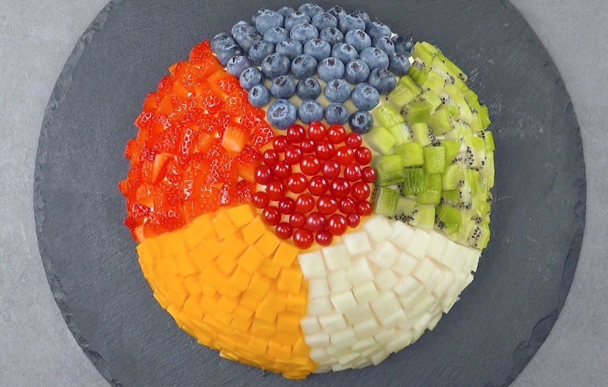 Bestreiche den Kuchen gleichmäßig mit Frischkäsefrosting. Schneide dann das Obst in möglichst gleich große Stücke und drücke diese so auf das Frischkäsefrosting, sodass das Muster eines Wasserballs auf dem Kuchen entsteht.