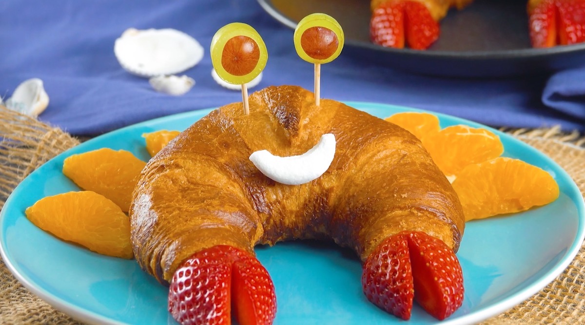 Schneide die spitzen Enden der Croissants ab. Halbiere die Erdbeeren und schneide die Hälften zu Krabbenscheren. Lege diese an die Schnittstellen der Croissants. Schäle die Mandarinen und lege je drei Stück als Beinchen an die Seiten des Croissants. Schneide dann aus einem Marshmallow einen Mund aus und lege ihn auf die werdende Krabbe. Nun fehlen nur noch die Augen. Schneide dafür Weintrauben in Scheiben und stecke sie mithilfe von Zahnstochern in das Croissants – fertig ist die niedliche Krabbe.