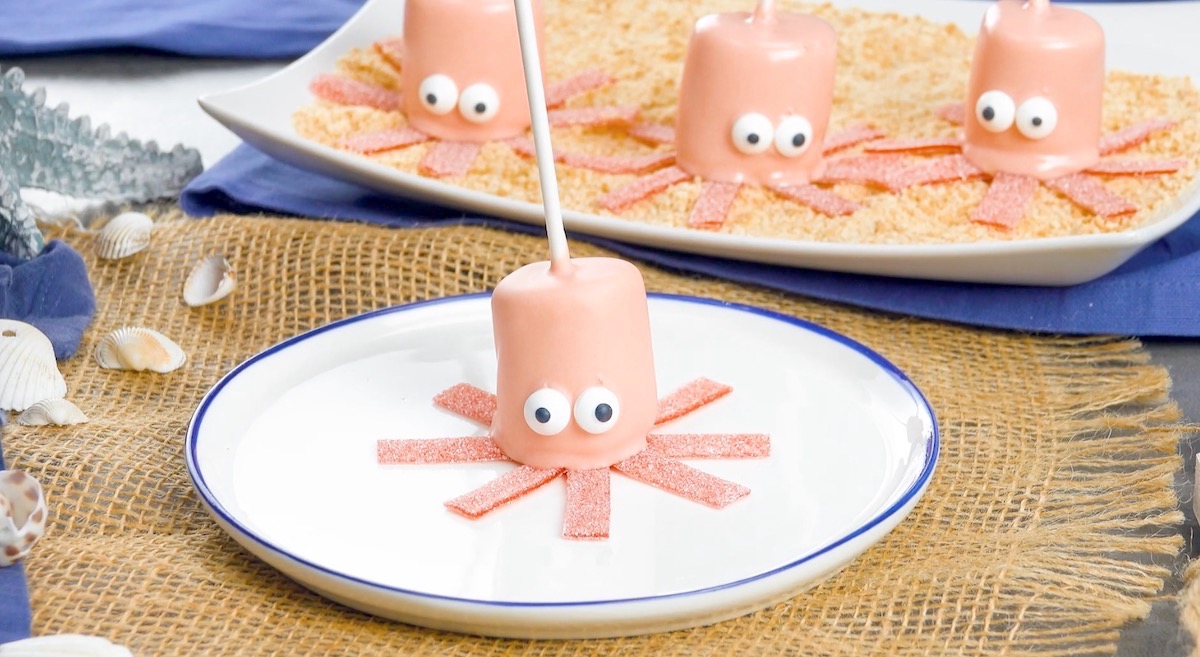 Schneide jedes Fruchtgummiband in vier gleich große Streifen. Lege die Streifen für jeden Kraken über Kreuz. Schiebe jedes Marshmallow auf einen Lollistiel und tauche es dann in flüssige Kuvertüre, lass es kurz abtropfen und setze es auf die Fruchtgummistreifen. Drücke die Augen vorsichtig in die fest werdende Kuvertüre. Sehen die Kraken nicht niedlich aus?