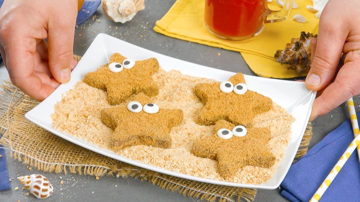 4.3 Schmücke jeden Seestern mit einem Paar Augen. Platziere die Seesterne auf zerkleinerten Butterkeksen, die als Strandsand fungieren – allein der Anblick fühlt sich wie Urlaub an, oder?