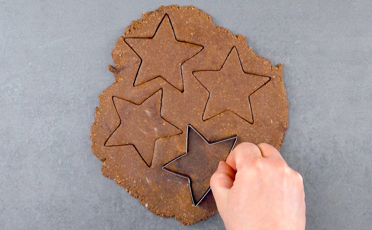 4.1 Verknete Puderzucker, Mandeln, Kakao und Milch gut mit den Händen und rolle die Masse gleichmäßig dick aus. Stich nun Sterne aus der Masse aus.