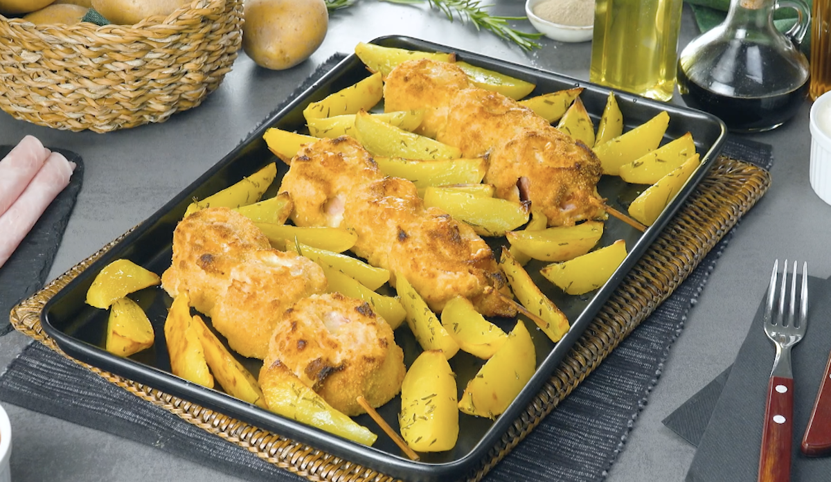 6. Hähnchen-Cordon-bleu als leckerer Spieß mit Kartoffelspalten Leckerschmecker zaubert hier Hähnchen-Cordon-bleu als leckeren Spieß, dazu gibt es Kartoffelspalten mit Rosmarin. Und das Beste: Alles kommt aus dem Ofen! Praktischer geht’s kaum. Hier findest du das Rezept für das Cordon bleu am Spieß.