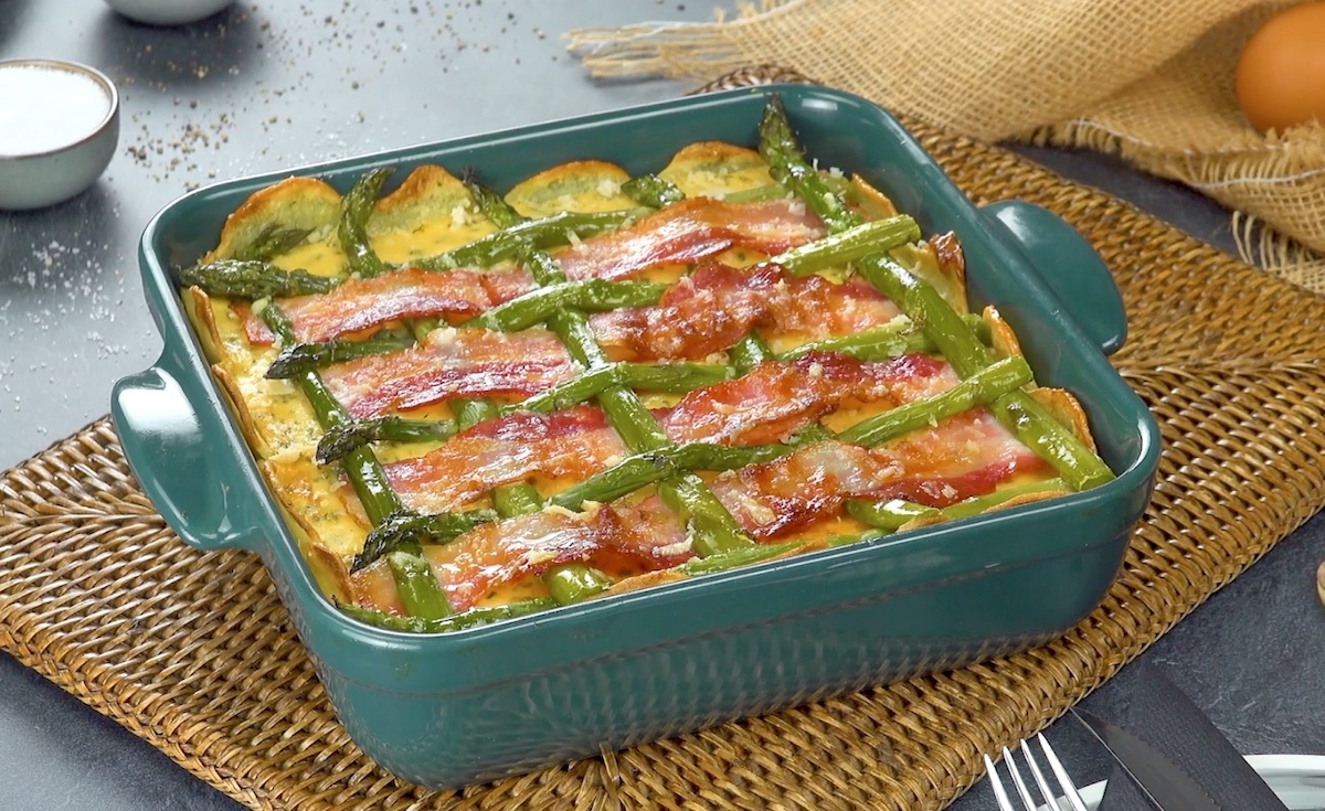 Spargel kommt für gewöhnlich mit Sauce hollandaise und Kartoffeln auf den Tisch. Um für etwas Spargel-Abwechslung zu sorgen, haben wir uns etwas Raffiniertes ausgedacht: eine herrlich frische Quiche, die mit einem Geflecht aus grünem Spargel und Speck bedeckt ist.