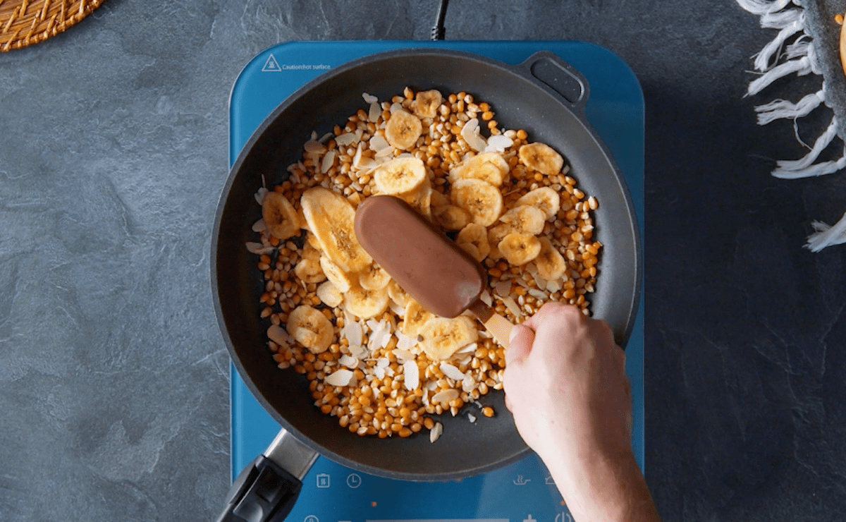 5.1 Gib Pflanzenöl in die Pfanne und füge Popcornmais, Mandelsplitter, Bananenchips und das „Magnum“-Eis hinzu. Setze einen Deckel auf die Pfanne und warte, bis die Maiskörner aufgepoppt sind.