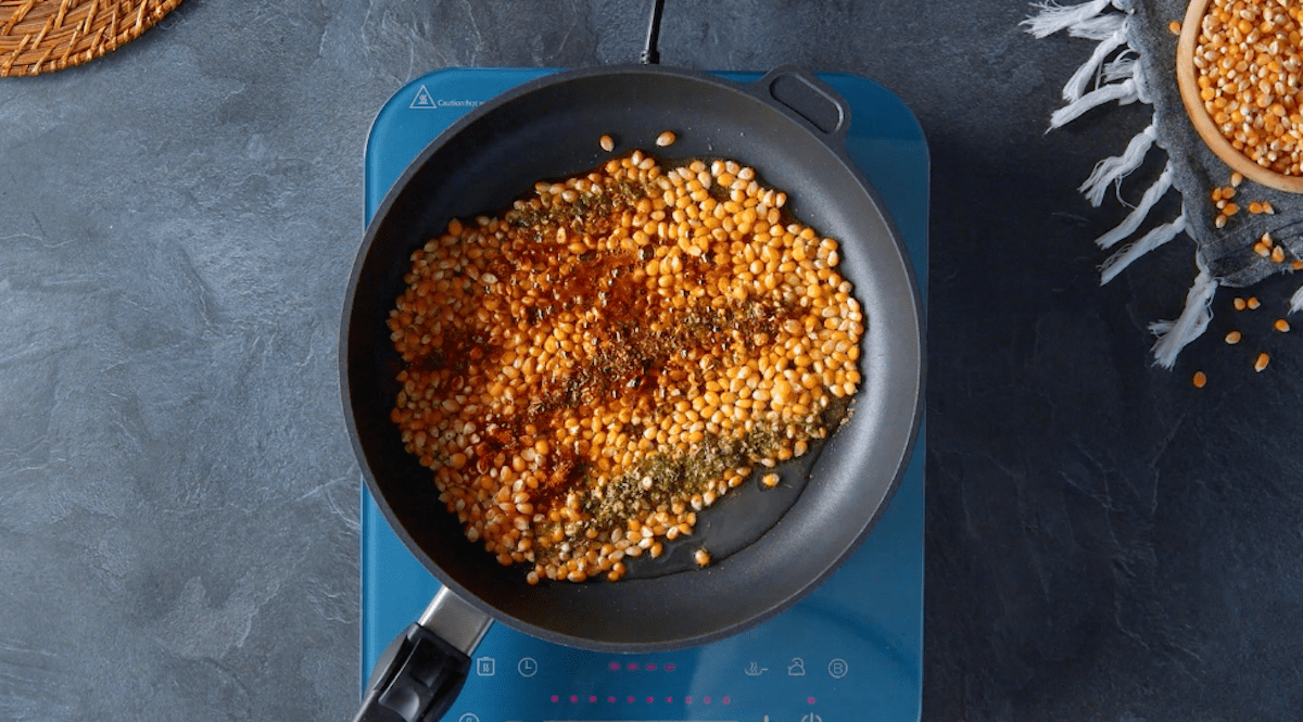 6.1 Gib Pflanzenöl, Popcornmais, Chipotlepulver, getrocknete Minze und Meersalz in die Pfanne. Setze einen Deckel darauf und warte, bis die Maiskörner aufgepoppt sind.