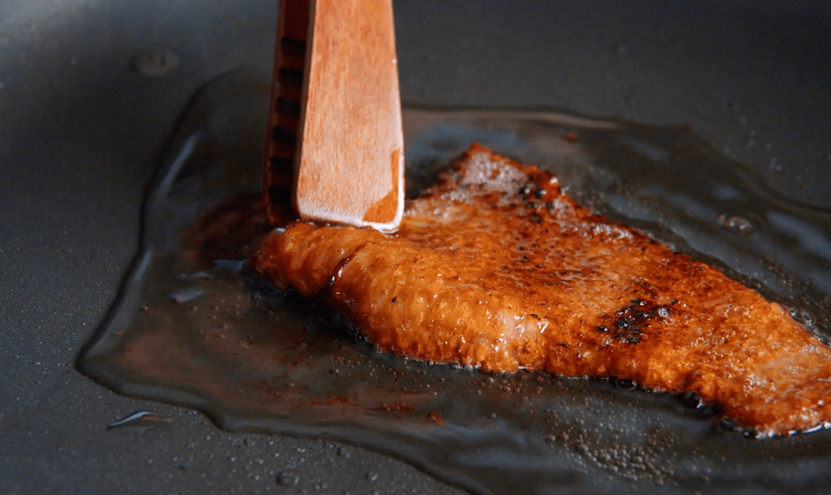 2.1 Lege die Haut der Entenbrust in eine kalte Pfanne und erwärme sie ganz langsam (so tritt das Fett vollständig aus der Haut aus). Wenn die Haut goldbraun und knusprig ist, nimm sie aus der Pfanne.