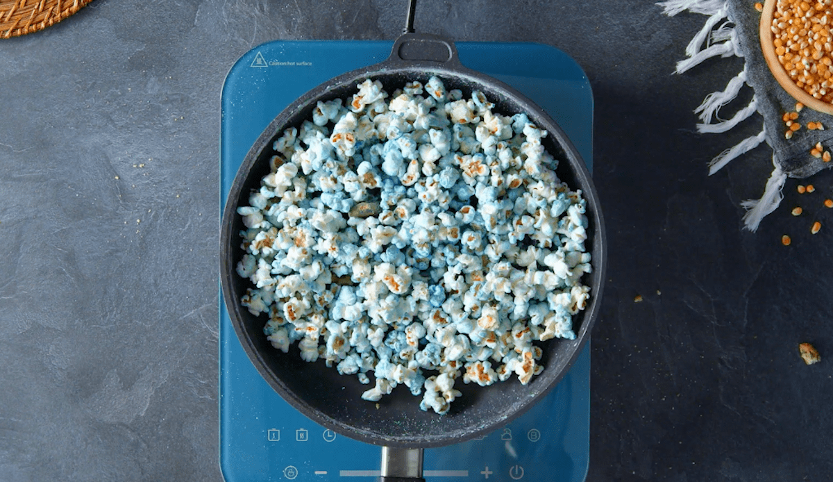 Tipp: Um ein noch intensiveres Blau zu bekommen, vermische Puderzucker mit blauem Lebensmittelpulver und gib es zum Popcorn hinzu.