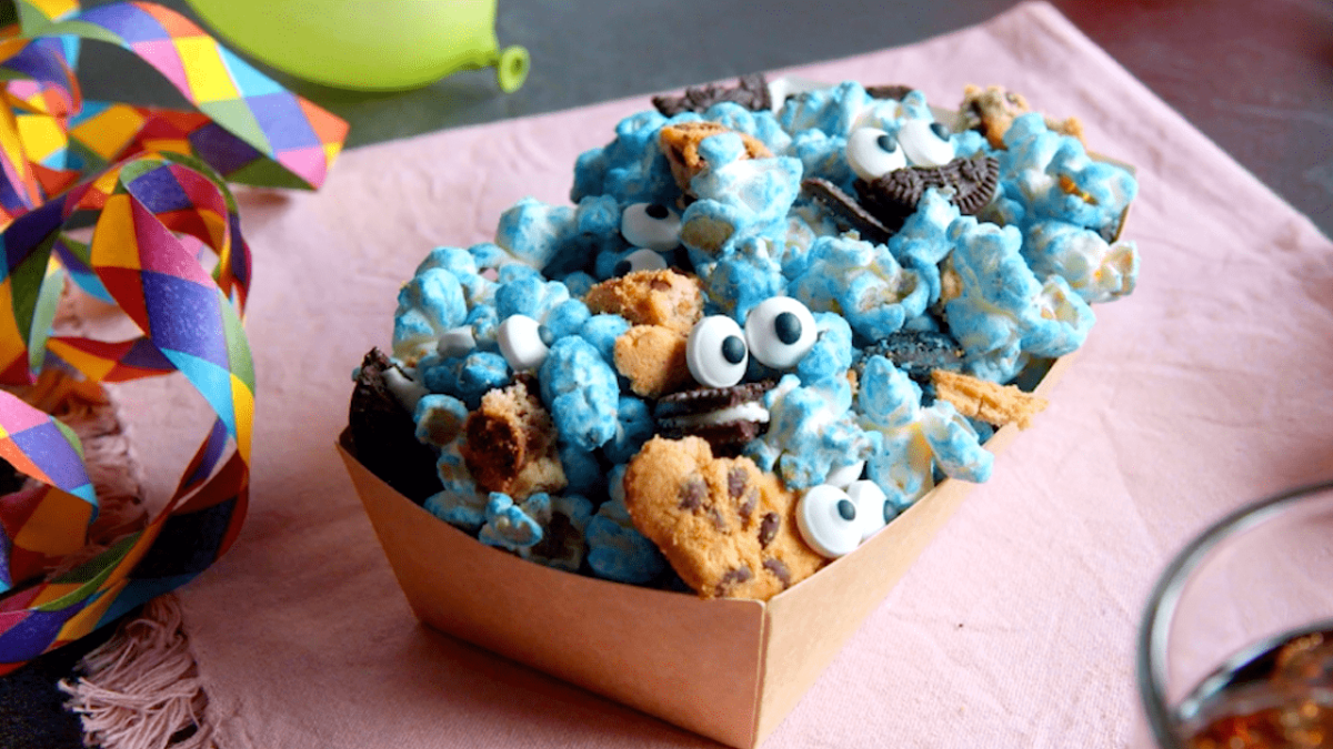 3.2 Vermenge alles gut miteinander und fülle das Popcorn in eine Schüssel. Dekoriere das Krümelmonster-Popcorn noch mit Zuckeraugen.
