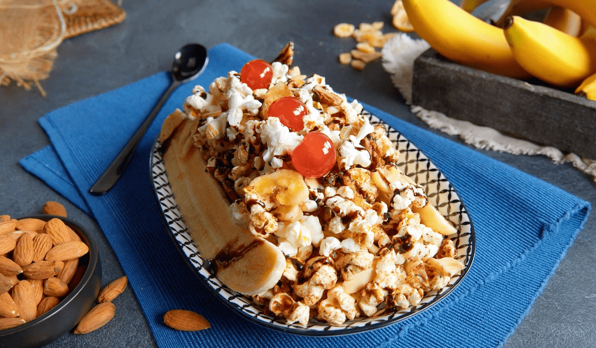 5.2 Vermenge alles gut miteinander und serviere das Bananensplit-Popcorn mit einer längs halbierten Banane, Schokoladensoße und Cocktailkirschen.