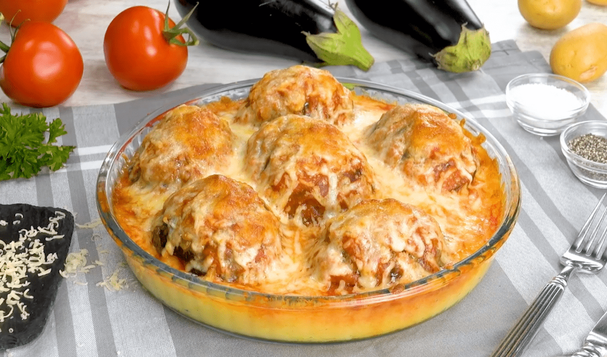 5. Köstlicher Auflauf: mit würzigem Hackfleisch gefüllte Aubergine auf Kartoffeln