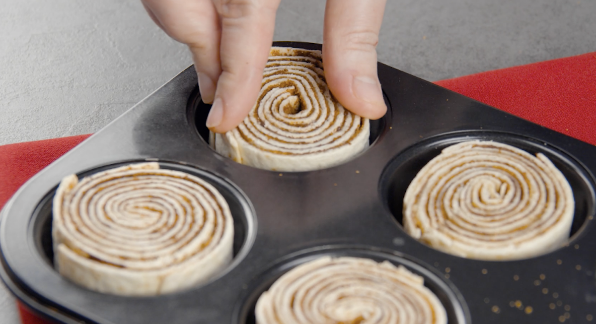 4.5 Lege nun in jede Mulde eine Tortilla-Schnecke und schiebe die Muffinform bei 180 °C Umluft für 15 Minuten in den Ofen.