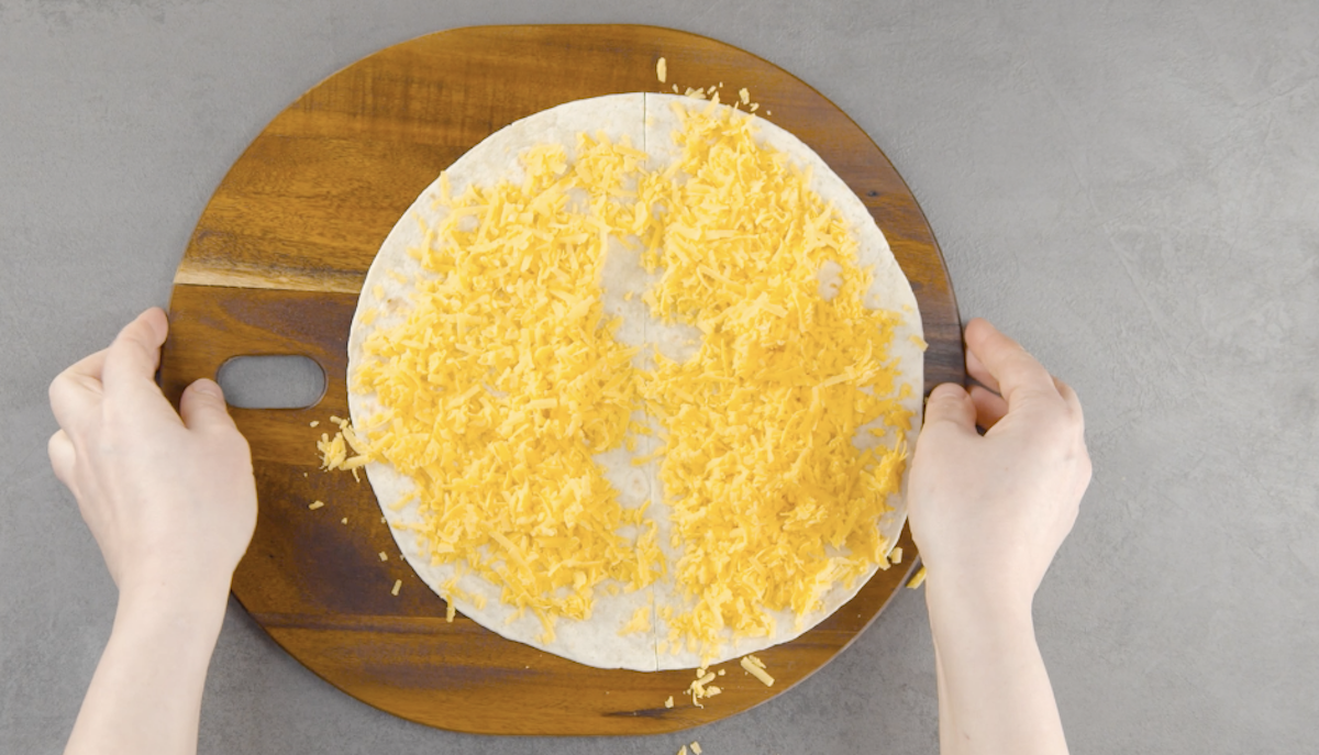 6.1 Schneide die Tortilla in der Mitte durch, bestreue sie mit Cheddar und schiebe sie bei 175 °C Umluft für 8 Minuten in den Ofen.