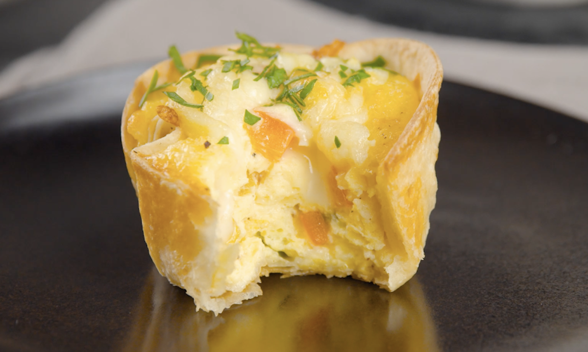 3.3 Gib die Paprikawürfel und den restlichen geriebenen Käse hinzu und schiebe die Muffinform bei 180 °C für 15 Minuten in den Ofen. Serviere die Tortilla-Muffins mit frischer Petersilie.