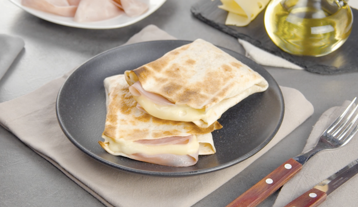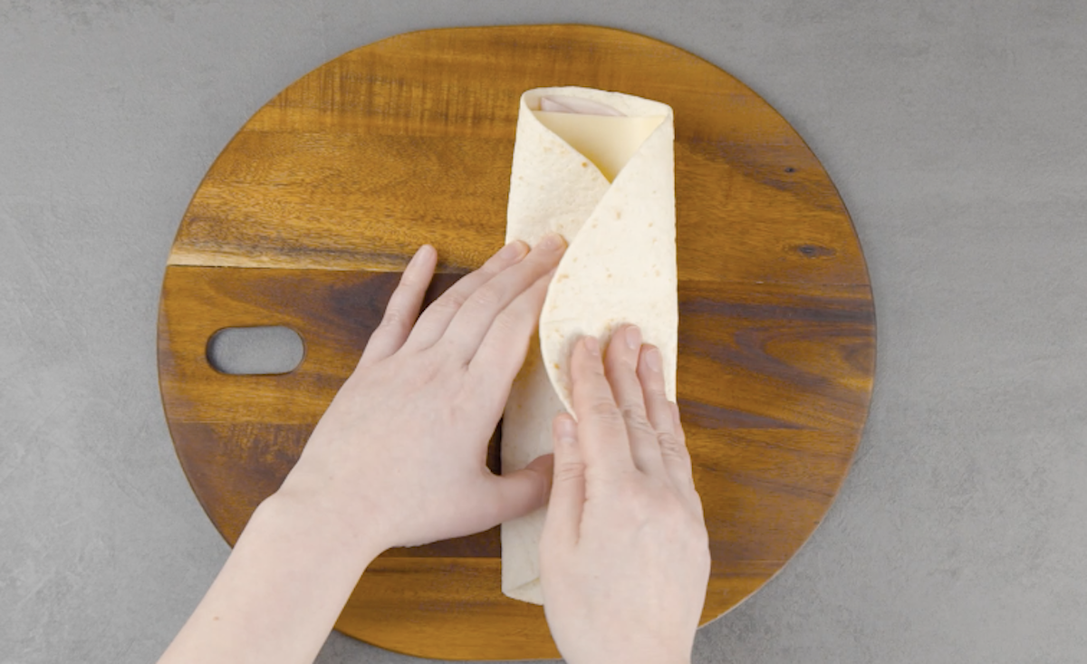 2.1 Lege Schinken und Käse mittig auf die Tortillas und klappe die beiden Seiten zur Mitte hin ein.