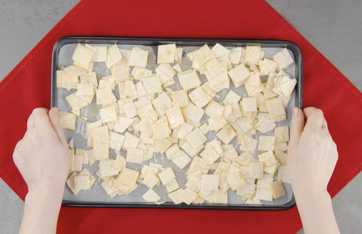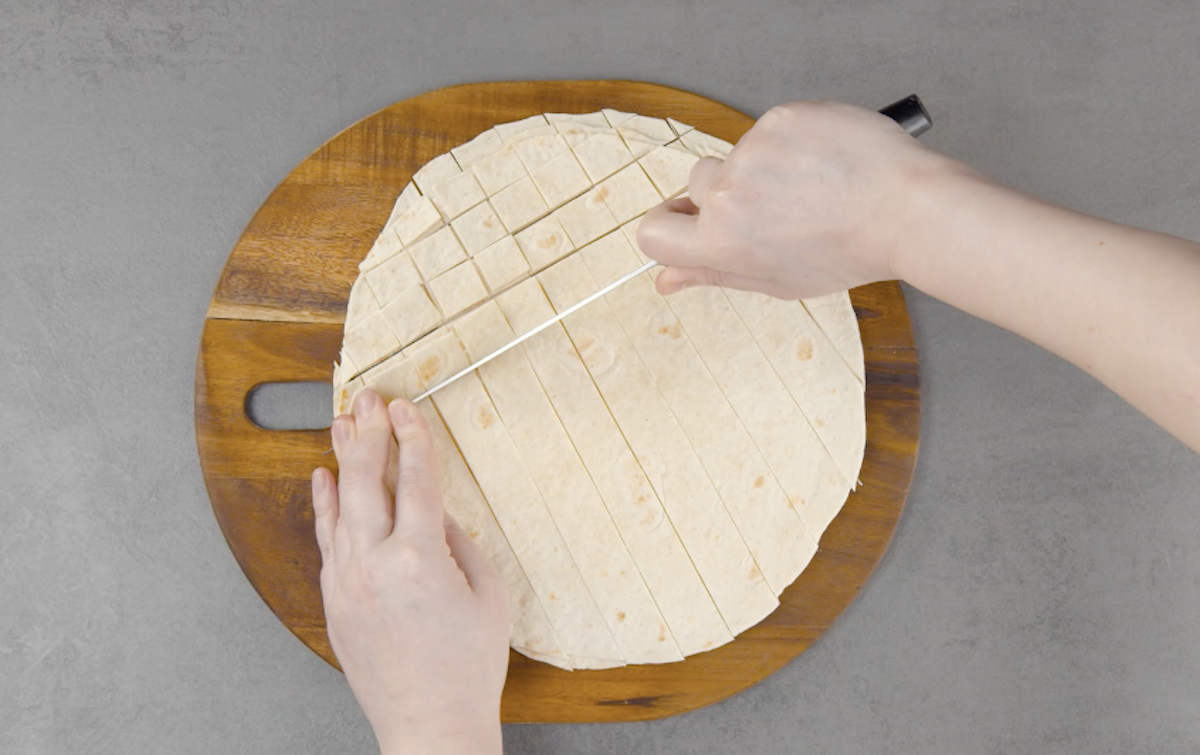 1.1 Lege die Tortillas aufeinander und schneide sie so ein, dass kleine Quadrate entstehen.