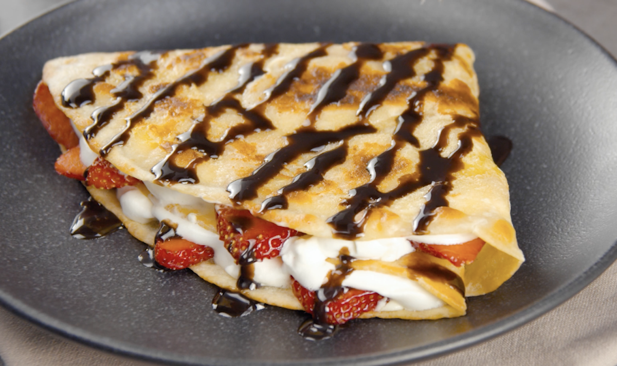 5.3 Verteile nun auf der Hälfte der Tortilla Erdbeerscheiben und klappe alles im Uhrzeigersinn zusammen. Serviere den Tortilla-Crêpe mit Schokosoße.