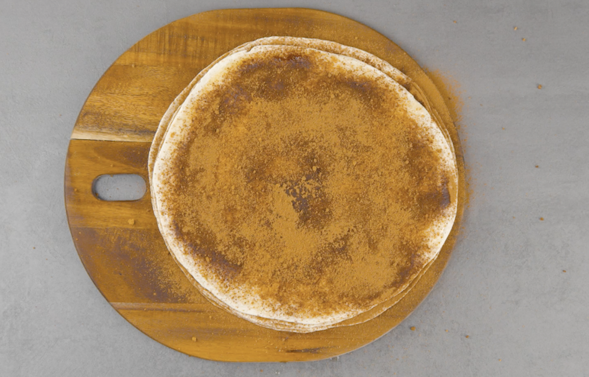 4.2 Wiederhole diesen Vorgang, bis die vier mit Butter, Zucker und Zimt belegten Tortillas aufeinanderliegen.