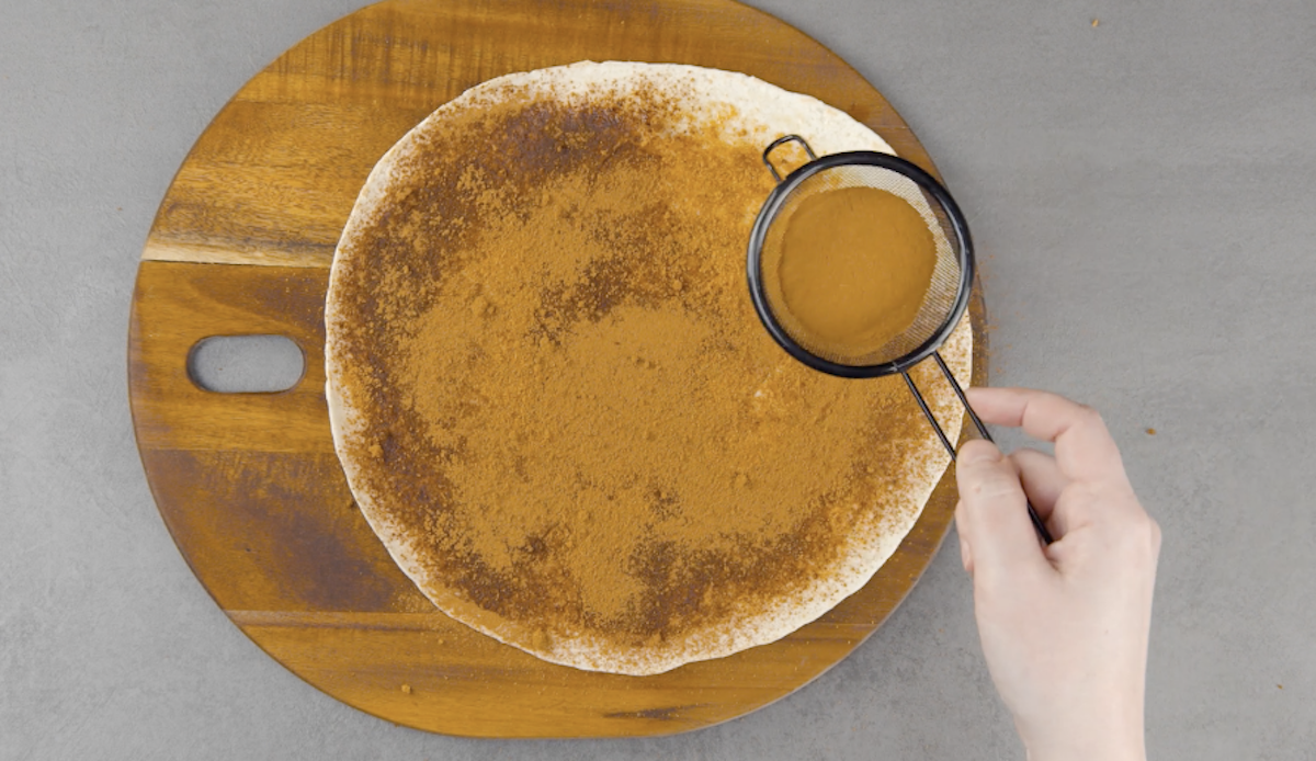 4.1 Bestreiche die erste Tortilla mit flüssiger Butter und bestreue sie dann mit Zucker und Zimt. Lege dann die nächste Tortilla darauf.