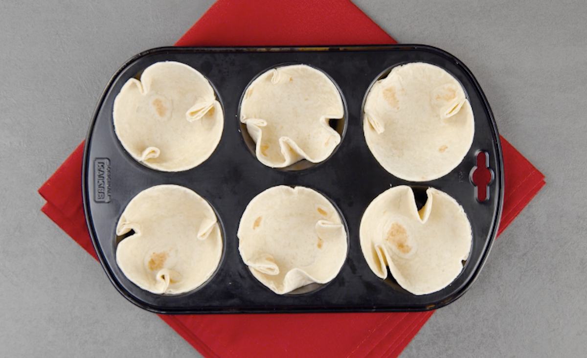 3.1 Stich aus den Tortillas sechs Kreise aus und lege diese in die Mulden einer eingefetteten Muffinform.