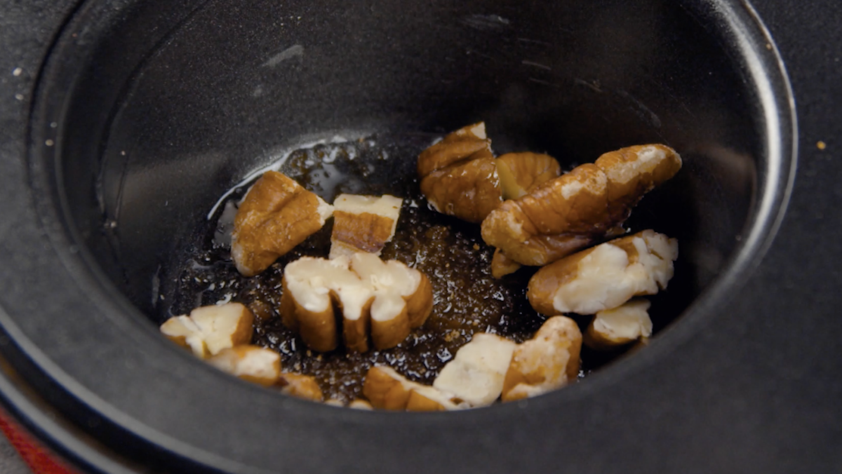 4.4 Streiche eine Muffinform mit flüssiger Butter aus und gib braunen Zucker und gehackte Pekannüsse in die Mulden.