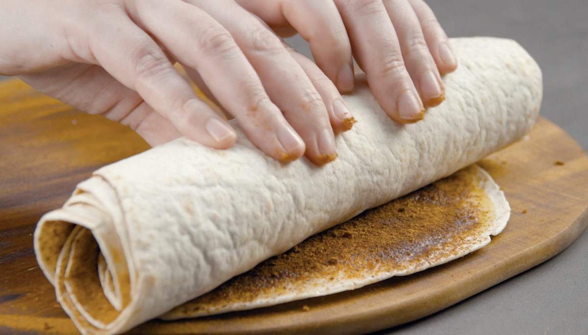 4.3 Rolle die Tortillas zusammen und schneide sie in Scheiben, sodass kleine Tortilla-Schnecken entstehen.