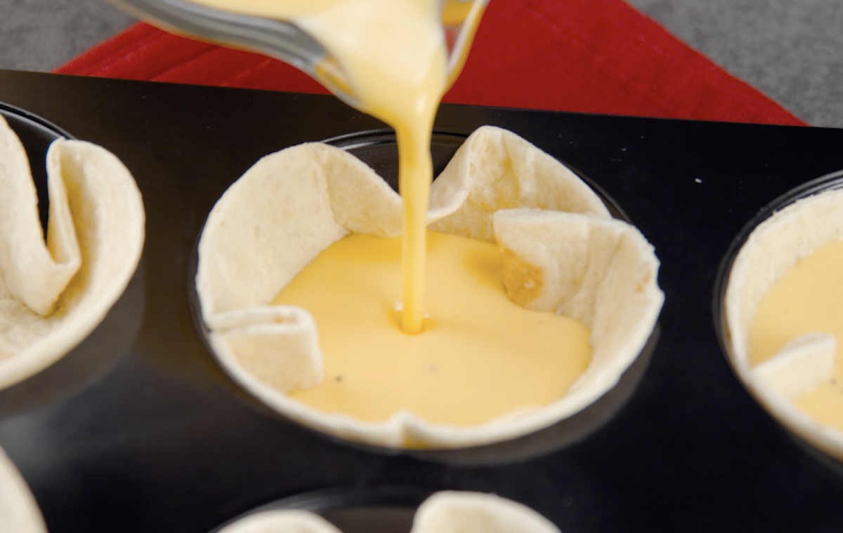 3.2 Vermische Eier mit Sahne, der Hälfte des geriebenen Käses, Salz und Pfeffer und befülle damit die mit Tortillas ausgelegten Mulden der Muffinform.
