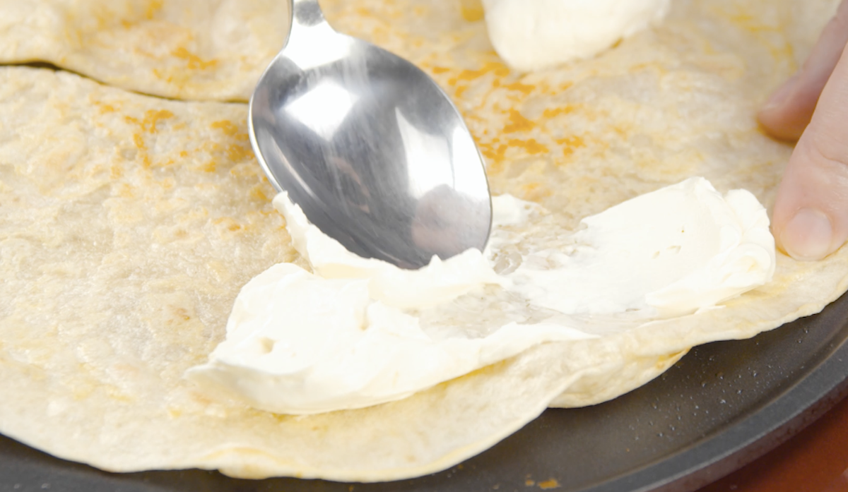 5.2 Tunke die Tortilla in die Eier-Milch und brate sie leicht von beiden Seiten in einer Pfanne an. Schneide die Tortilla bis zur Hälfte ein und bestreiche 3/4 der Fläche mit Frischkäse.
