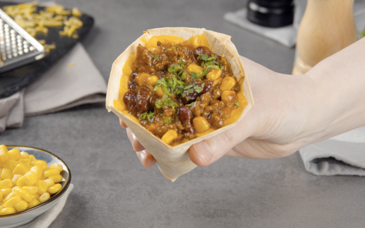 6.2 Rolle die Tortilla-Hälften zu Hörnchen zusammen und befülle sie mit Chili con Carne. Serviere die Hörnchen mit gehacktem Koriander.