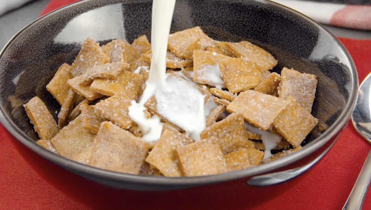 1.3 Bestreue die gebackenen Tortilla-Quadrate mit Zucker und Zimt. Vermische alles gut miteinander und genieße die Cini Minis mit kalter Milch.
