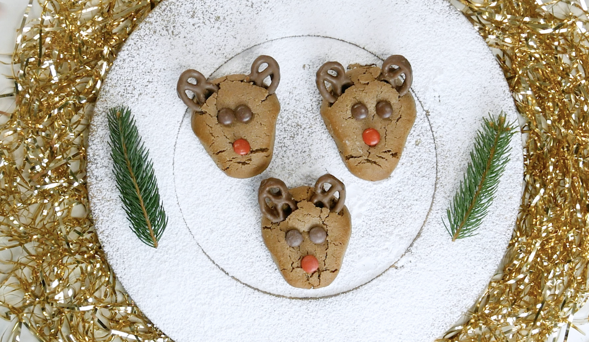 4.1 Forme aus dem Teig etwa tischtennisballgroße, runde Stücke. Bringe sie dann mit deinen Händen in die Form eines Rentier-Kopfes und backe sie für ca. 12 bis 15 Minuten bei 165 °C Ober- und Unterhitze.