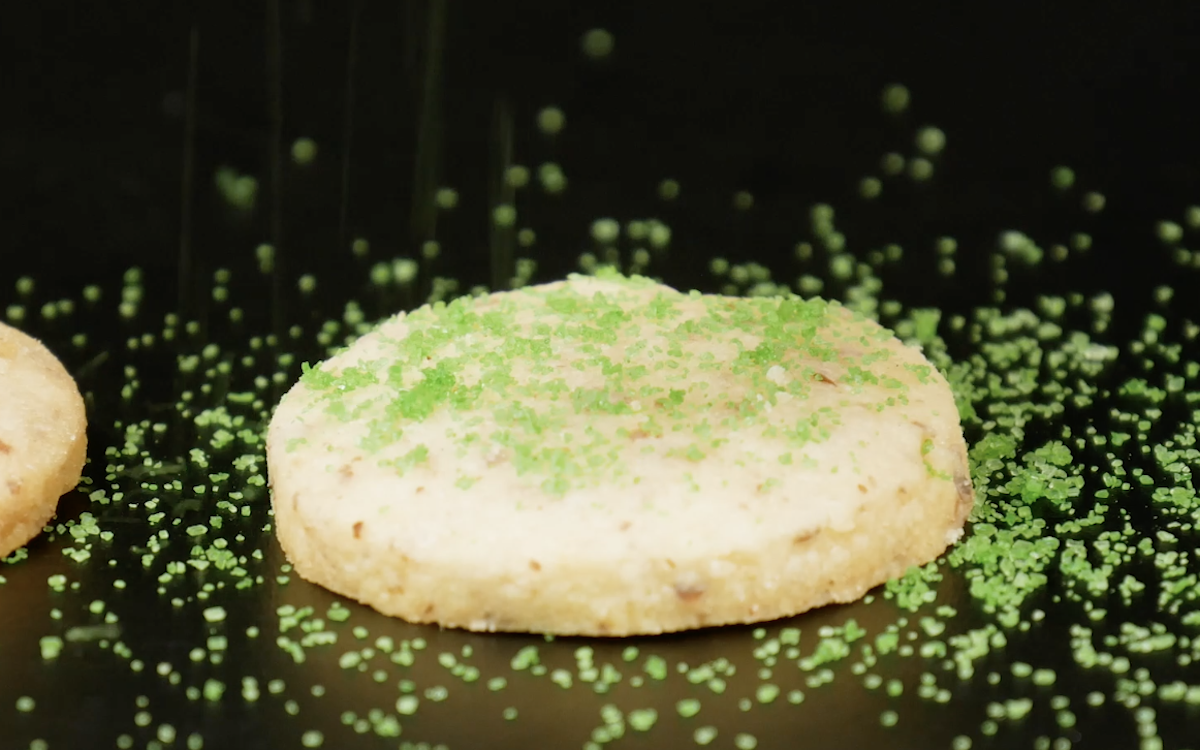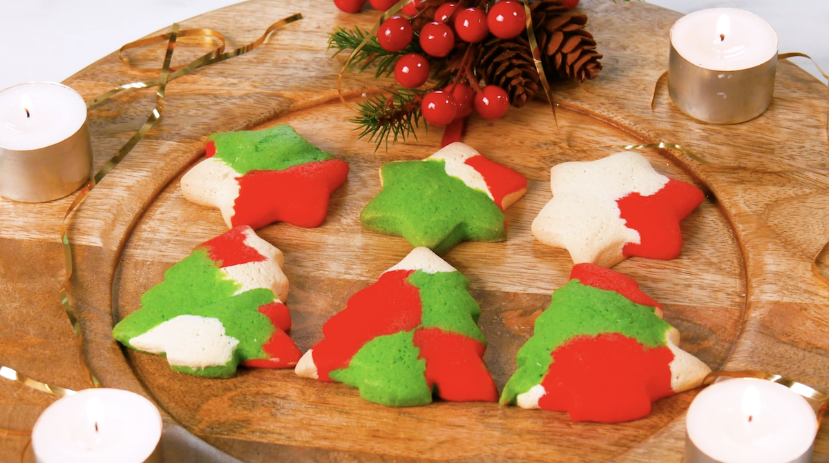 2.2 Nachdem die Plätzchen ausgekühlt sind, kannst du die Weihnachtsbäume „zusammenbauen“. Färbe den Zucker mit grüner Lebensmittelfarbe ein und bestreue die Plätzchen damit.