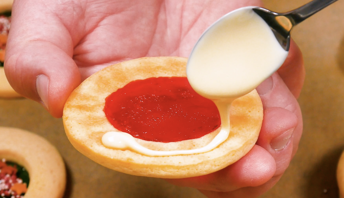 5.4 Bestreiche dann die Rückseite der anderen Hälfte der Plätzchen mit geschmolzener, weißer Schokolade.
