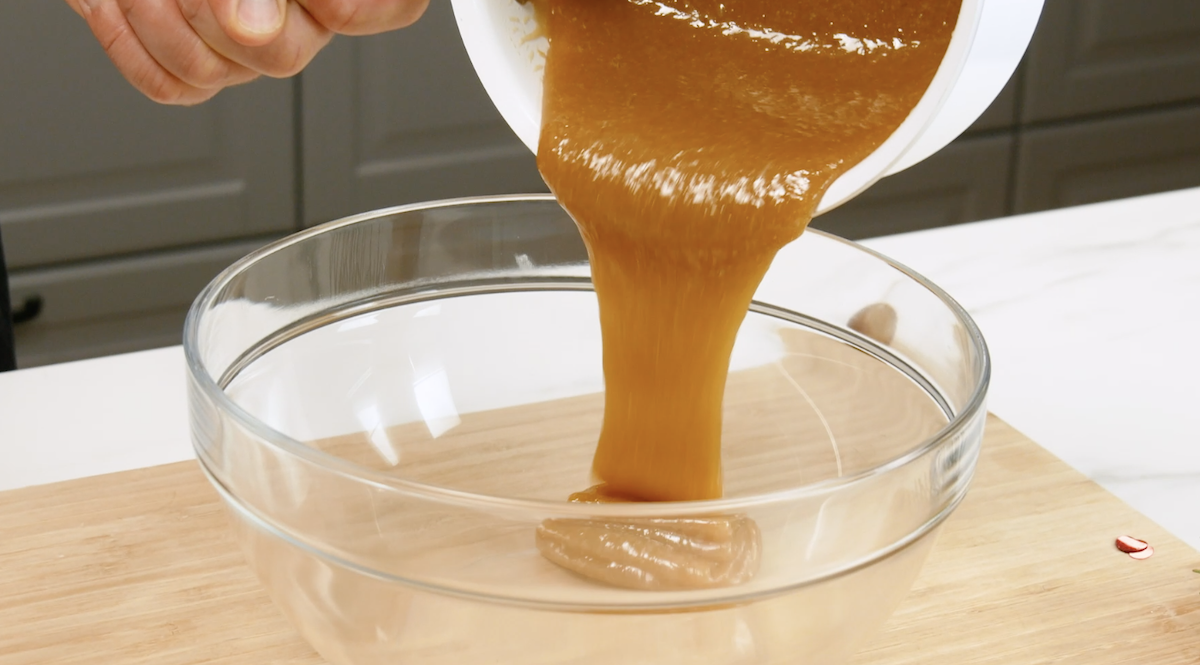 Gib den Honig mit dem Zucker und der Butter in einen Topf. Erhitze alles unter ständigem Rühren, bis sich der Zucker aufgelöst hat. Nimm die Mischung vom Herd, fülle alles in eine Schüssel und lass es abkühlen.