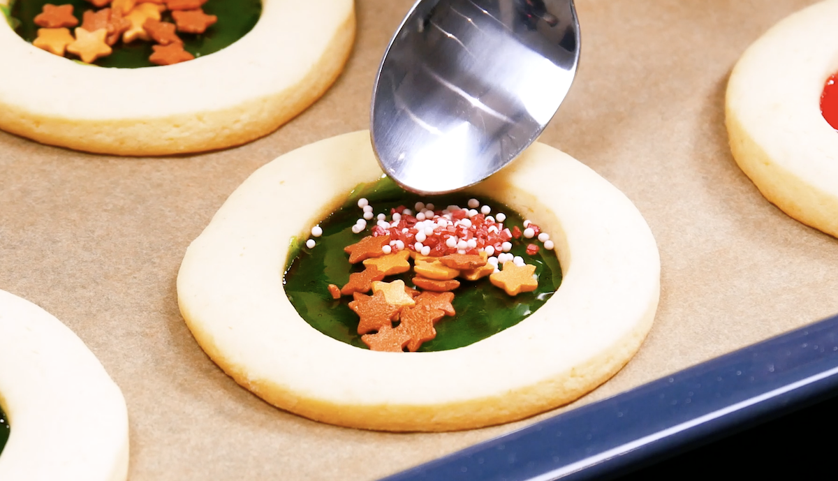 5.3 Lass die Plätzchen dann auskühlen. Befülle die Hälfte der Plätzchen mit Zuckerperlen und der restlichen Zucker-Deko.