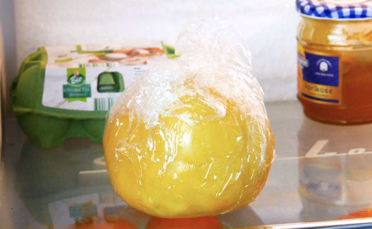 Füge der Masse Mandeln, Mehl, alle Gewürze und Ei hinzu und verknete alles mit einem Knethaken. Löse die Pottasche in einem Gefäß mit 2 EL Wasser auf und gib sie, wenn sie sich vollständig aufgelöst hat, dem Teig hinzu. Verknete den Teig auf höchster Stufe so lange weiter, bis er glänzt und nicht mehr klebrig ist. Er soll fest und formbar sein. (Wenn der Teig nicht die gewünschte Konsistenz erlangt, gib ruhig noch ein bisschen Mehl hinzu). Decke die Schüssel mit Frischhaltefolie ab und lasse den Teig mindestens 4 Stunden, am besten jedoch über Nacht, im Kühlschrank ruhen.