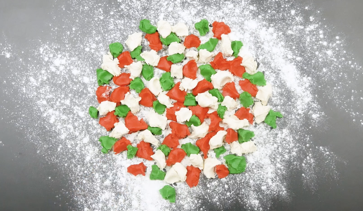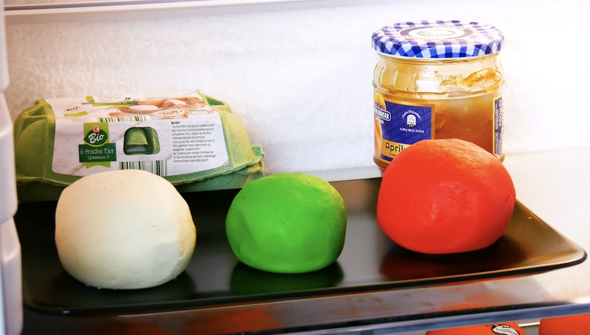 6.1 Teile die aus Rezept Nr. 5 verbliebene, andere Hälfte des Mürbeteigs in 3 gleich große Stücke. Färbe diese Stücke mit je einer Lebensmittelfarbe grün, rot und weiß ein. Stelle den Teig noch einmal für mindestens 30 Minuten kalt.