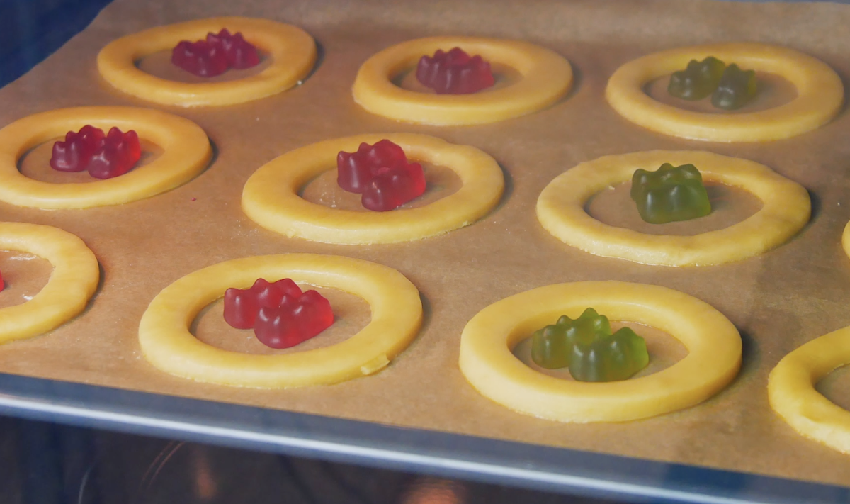 5.2 Lege die Ringe auf ein mit Backpapier ausgelegtes Backblech und platziere jeweils 2 Gummibärchen in die Mitte. Backe alles für 5 bis 7 Minuten bei 165 °C Ober- und Unterhitze.